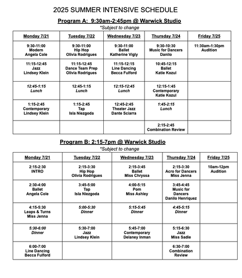 - Specific days and times TBD. If your dancer starts school this week let us know asap so we can plan accordingly.